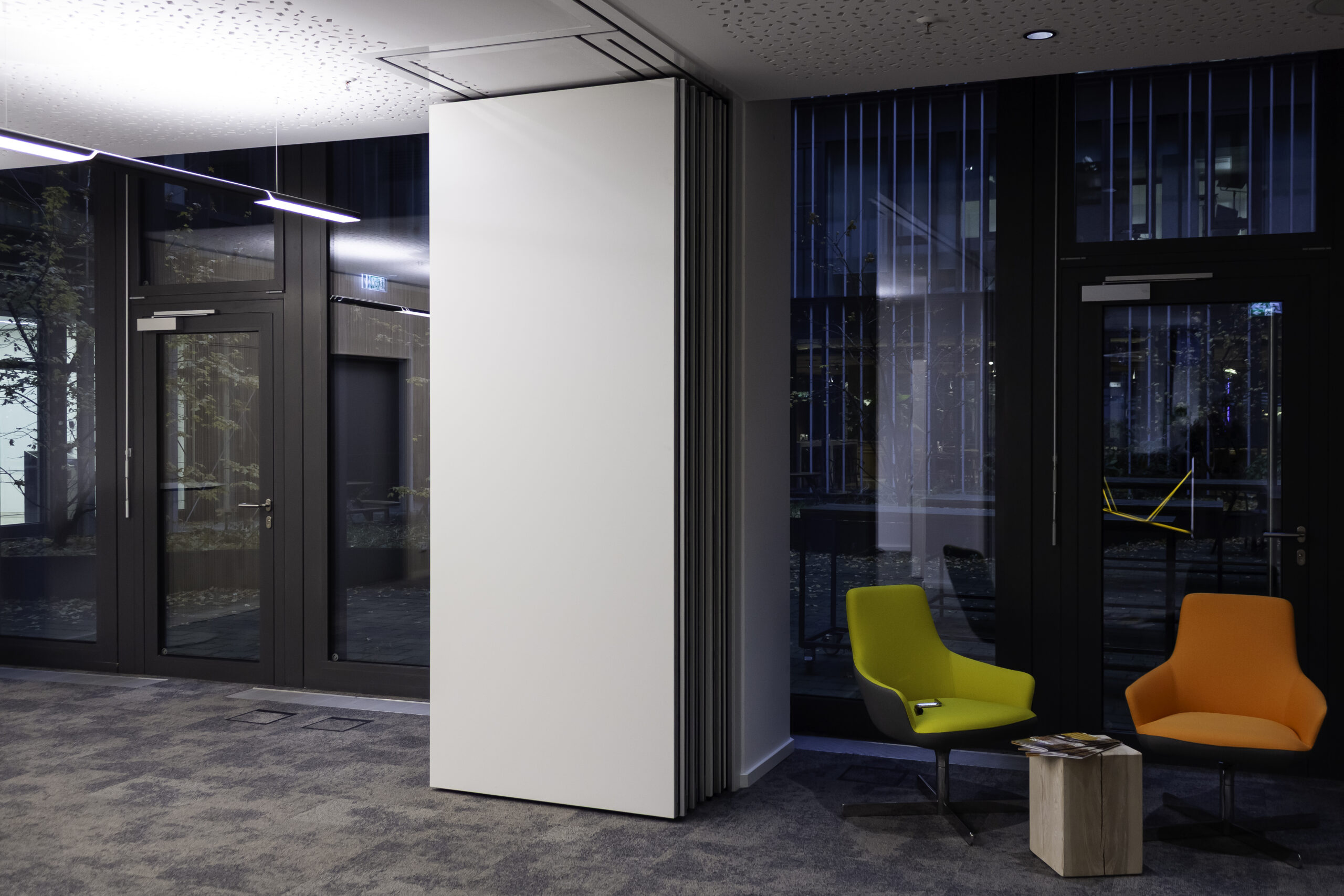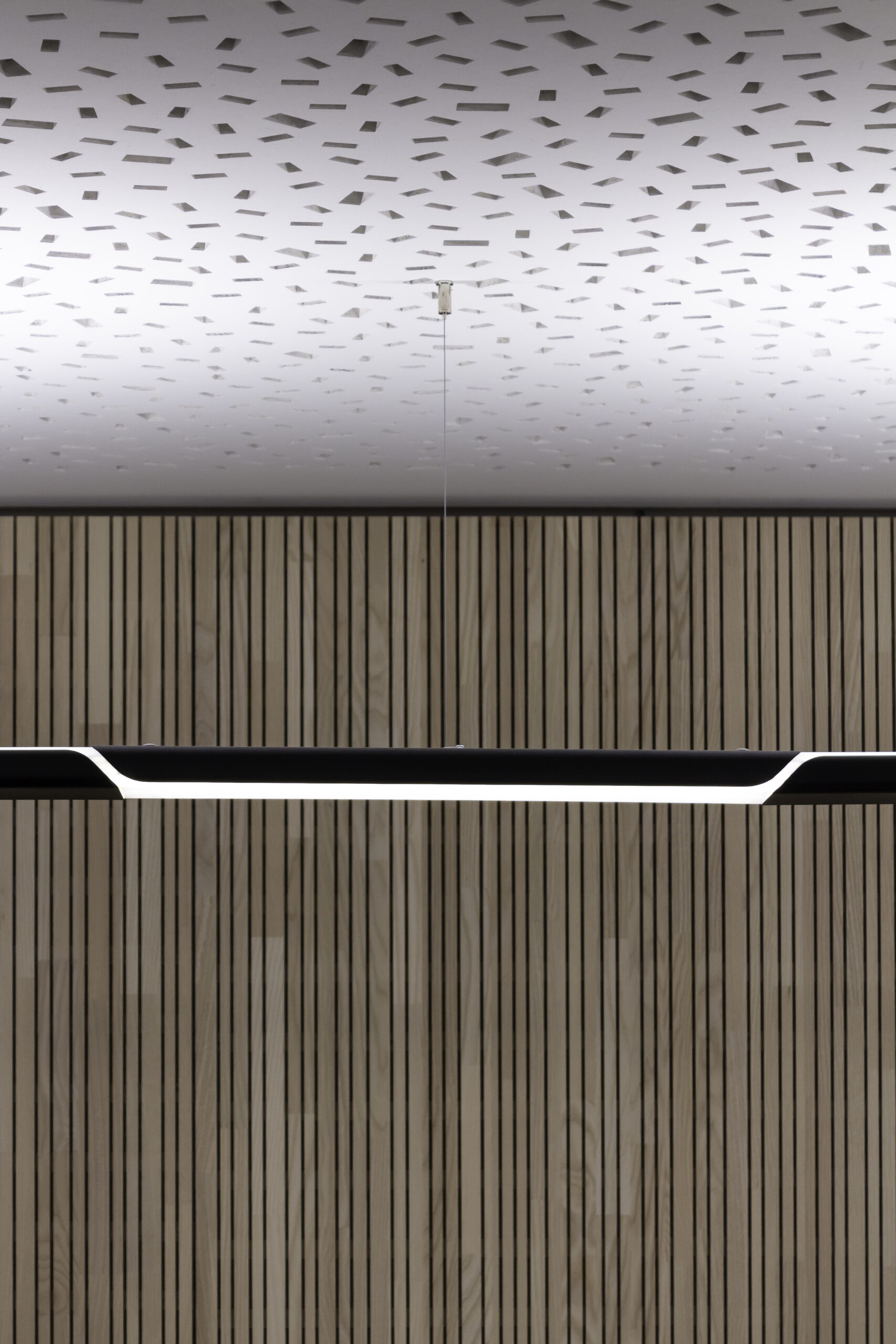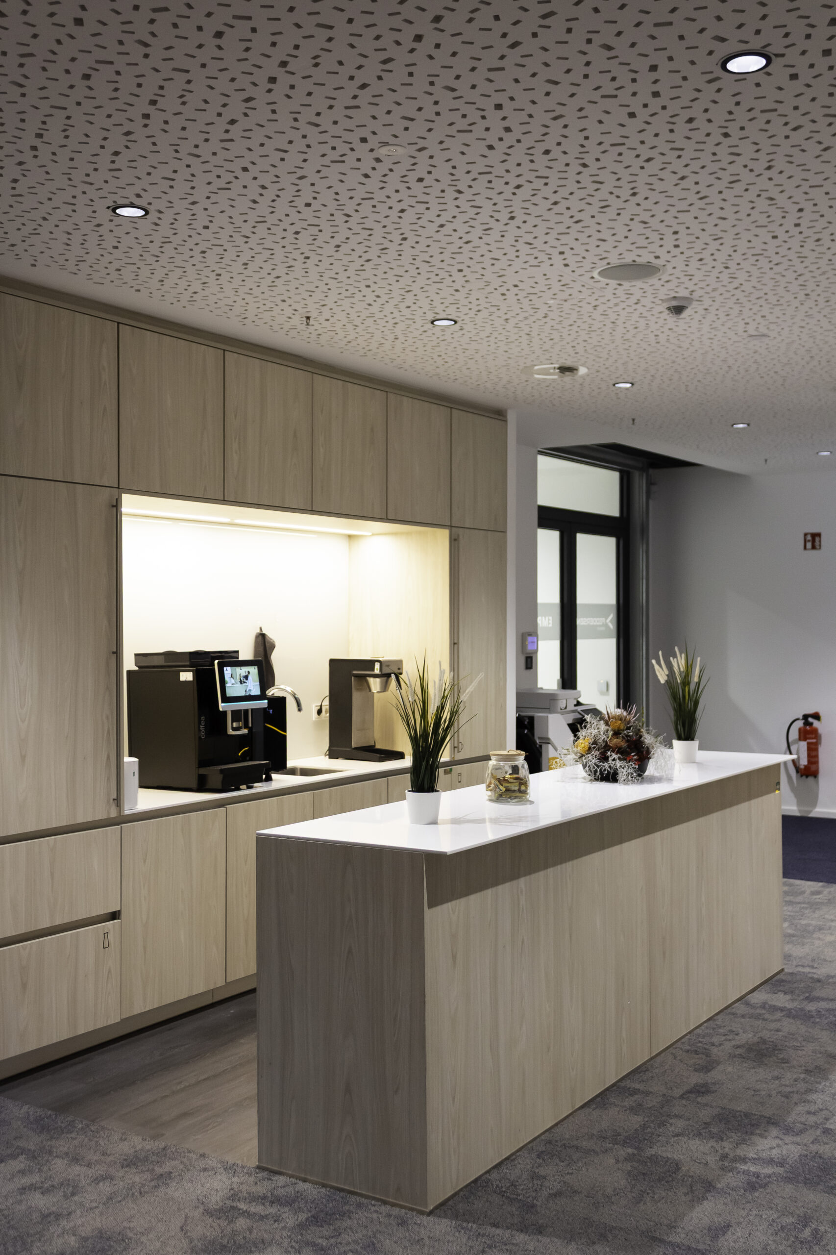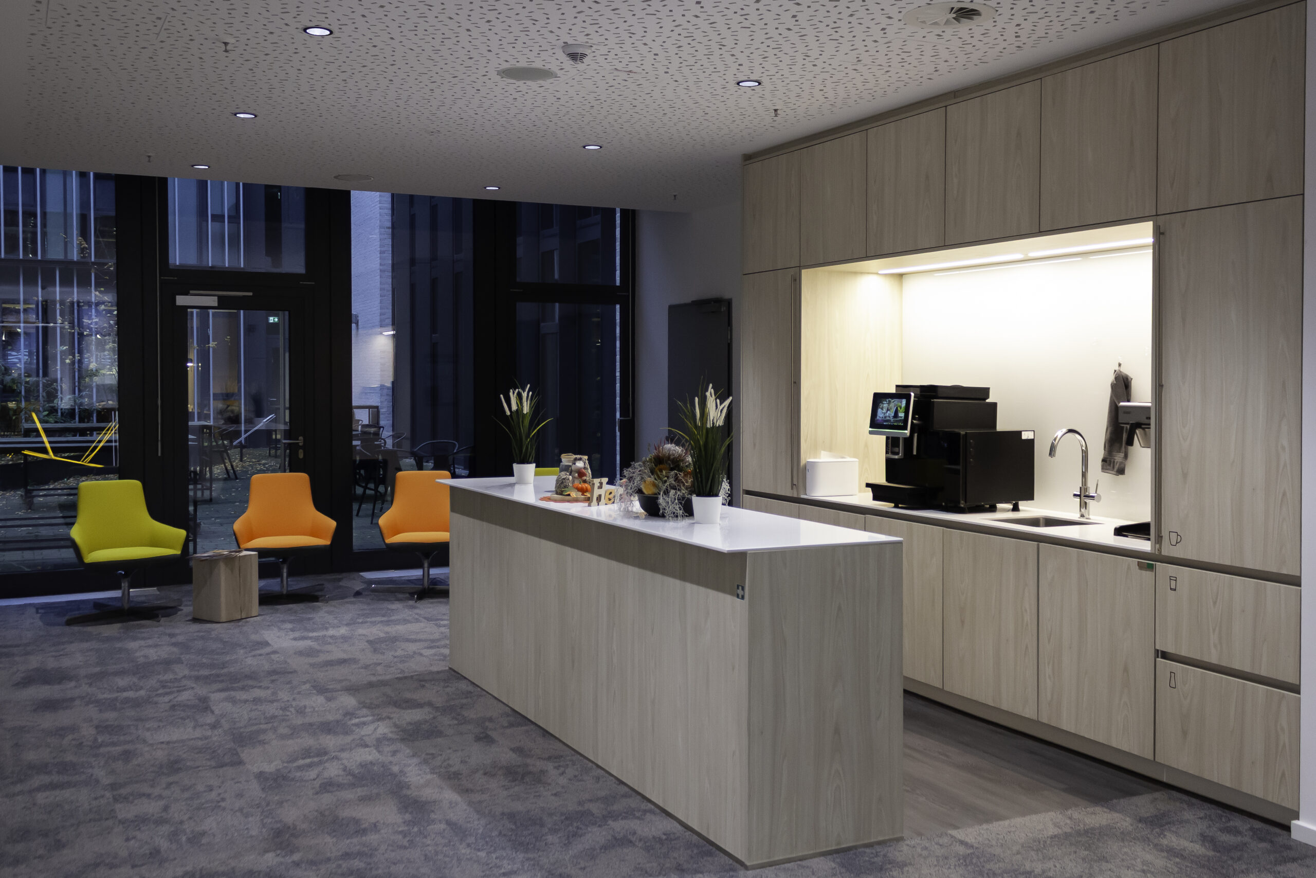 Neben dem Empfangsbereich entstand ein neuer Konferenzraum, der sich durch eine großzügige Falttür mit der offenen Teeküche verbinden lässt und so flexibel für Veranstaltungen genutzt werden kann. Die geölte, natürliche Holzverkleidung im Konferenzraum verbessert die Akustik und verleiht dem Raum zugleich eine warme, einladende Atmosphäre. Als erste Anlaufstelle für Gäste vereint der individuell entworfene Tresen Empfang und Poststelle in einem Element. Polygonale Holztafeln mit warm beleuchteten Fugen greifen die Form- und Farbensprache des Firmenlogos auf.