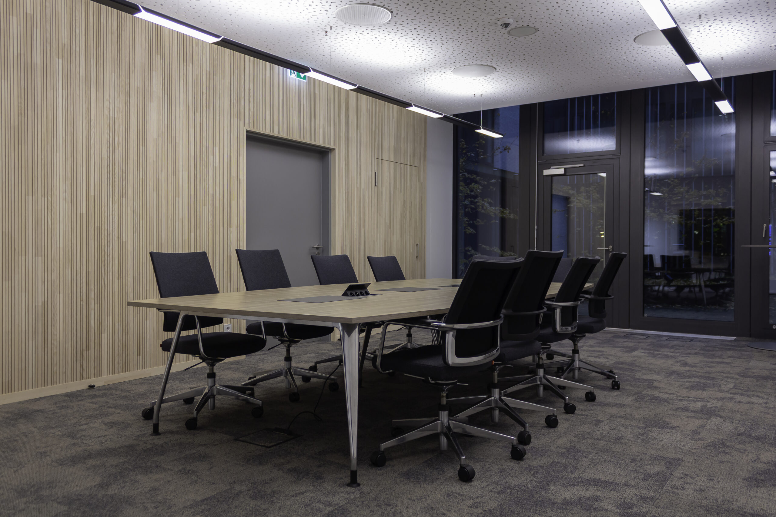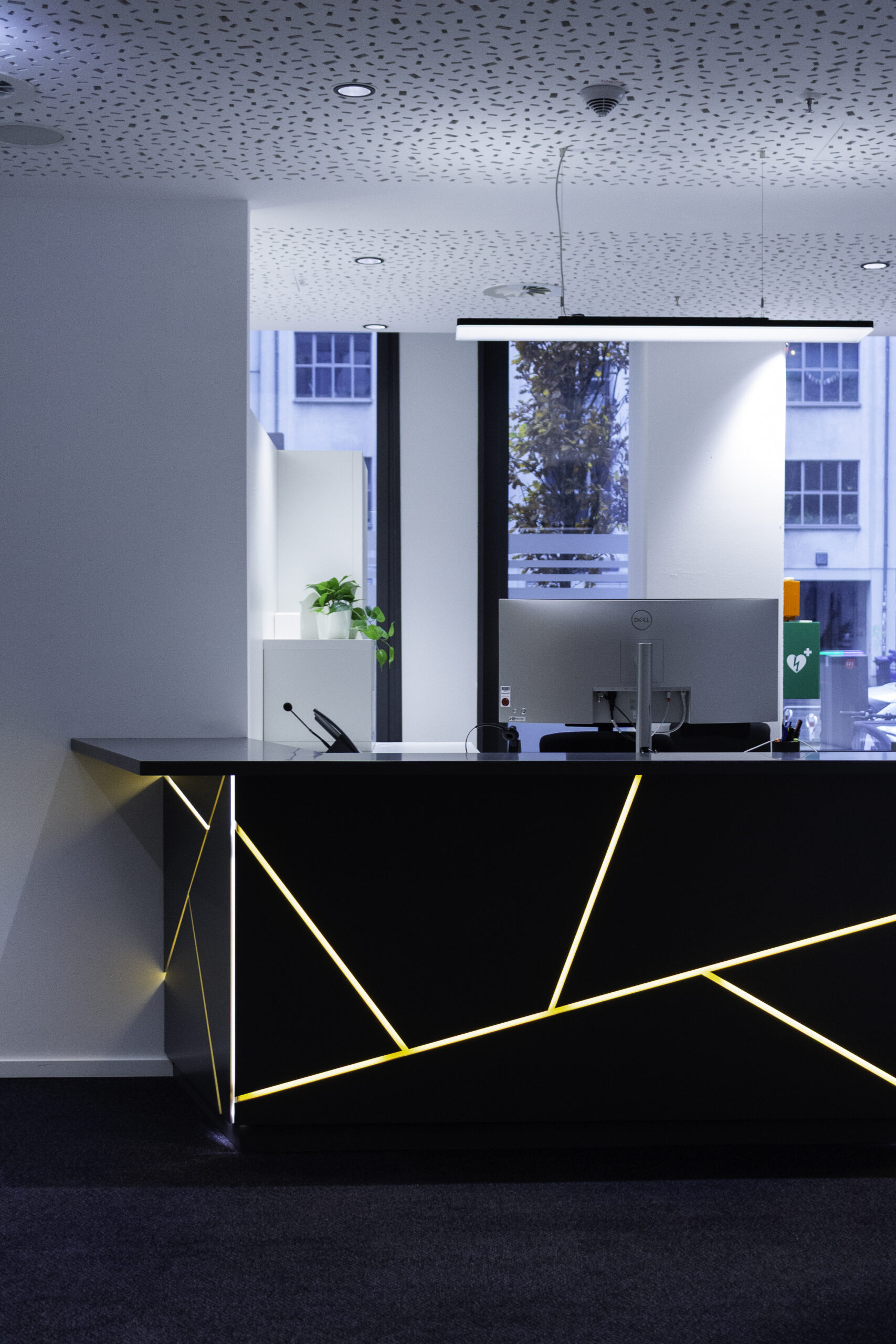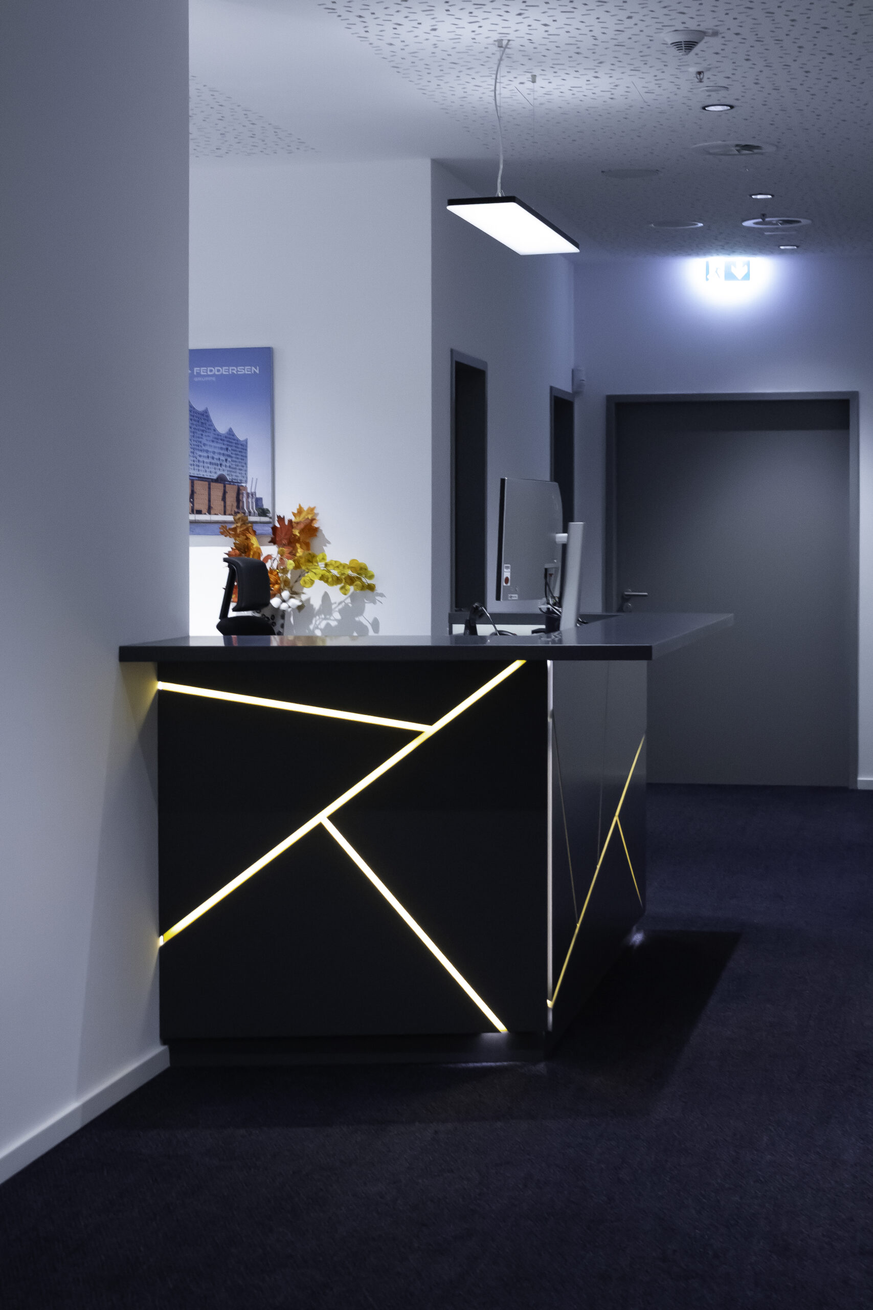 Neben dem Empfangsbereich entstand ein neuer Konferenzraum, der sich durch eine großzügige Falttür mit der offenen Teeküche verbinden lässt und so flexibel für Veranstaltungen genutzt werden kann. Die geölte, natürliche Holzverkleidung im Konferenzraum verbessert die Akustik und verleiht dem Raum zugleich eine warme, einladende Atmosphäre. Als erste Anlaufstelle für Gäste vereint der individuell entworfene Tresen Empfang und Poststelle in einem Element. Polygonale Holztafeln mit warm beleuchteten Fugen greifen die Form- und Farbensprache des Firmenlogos auf.