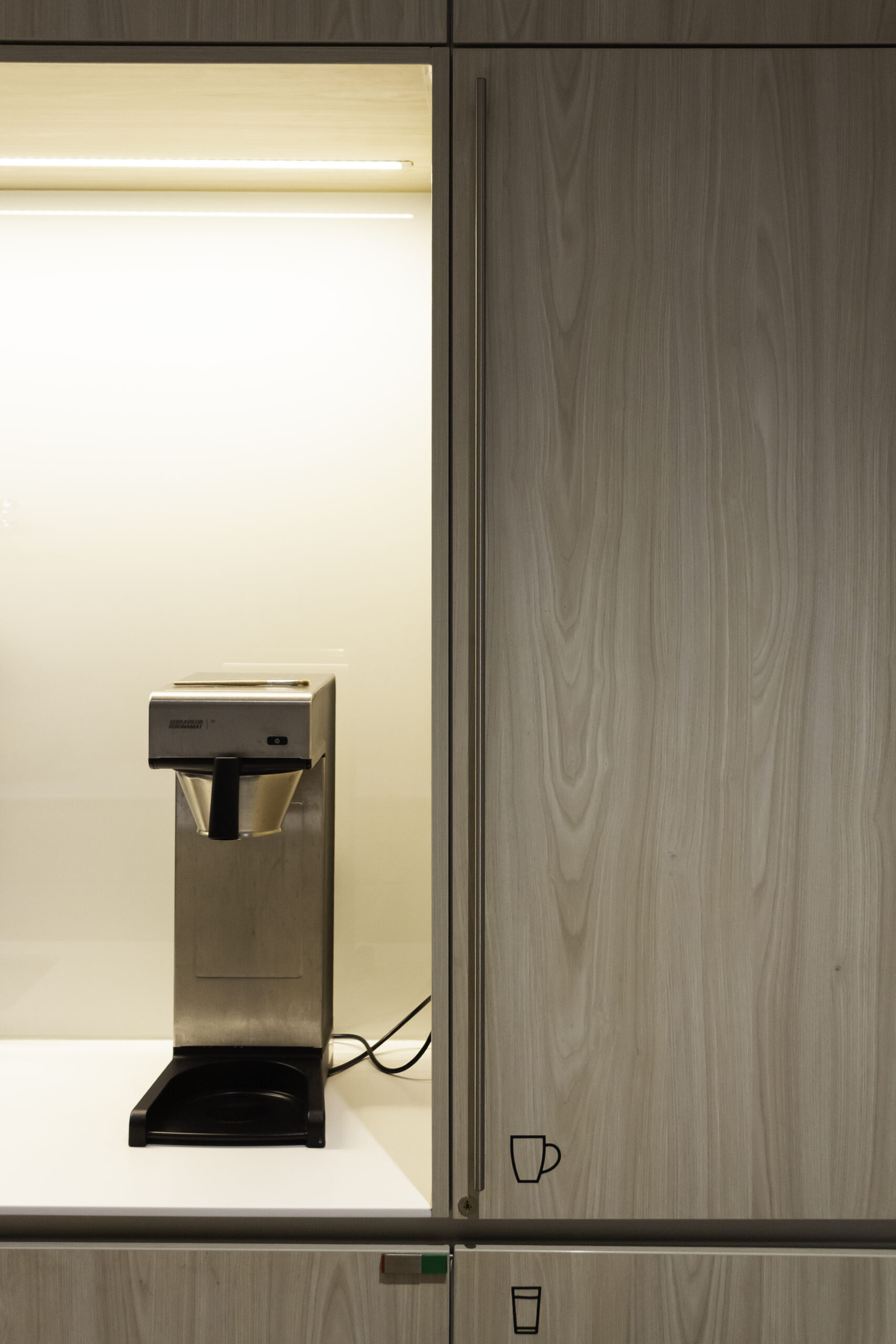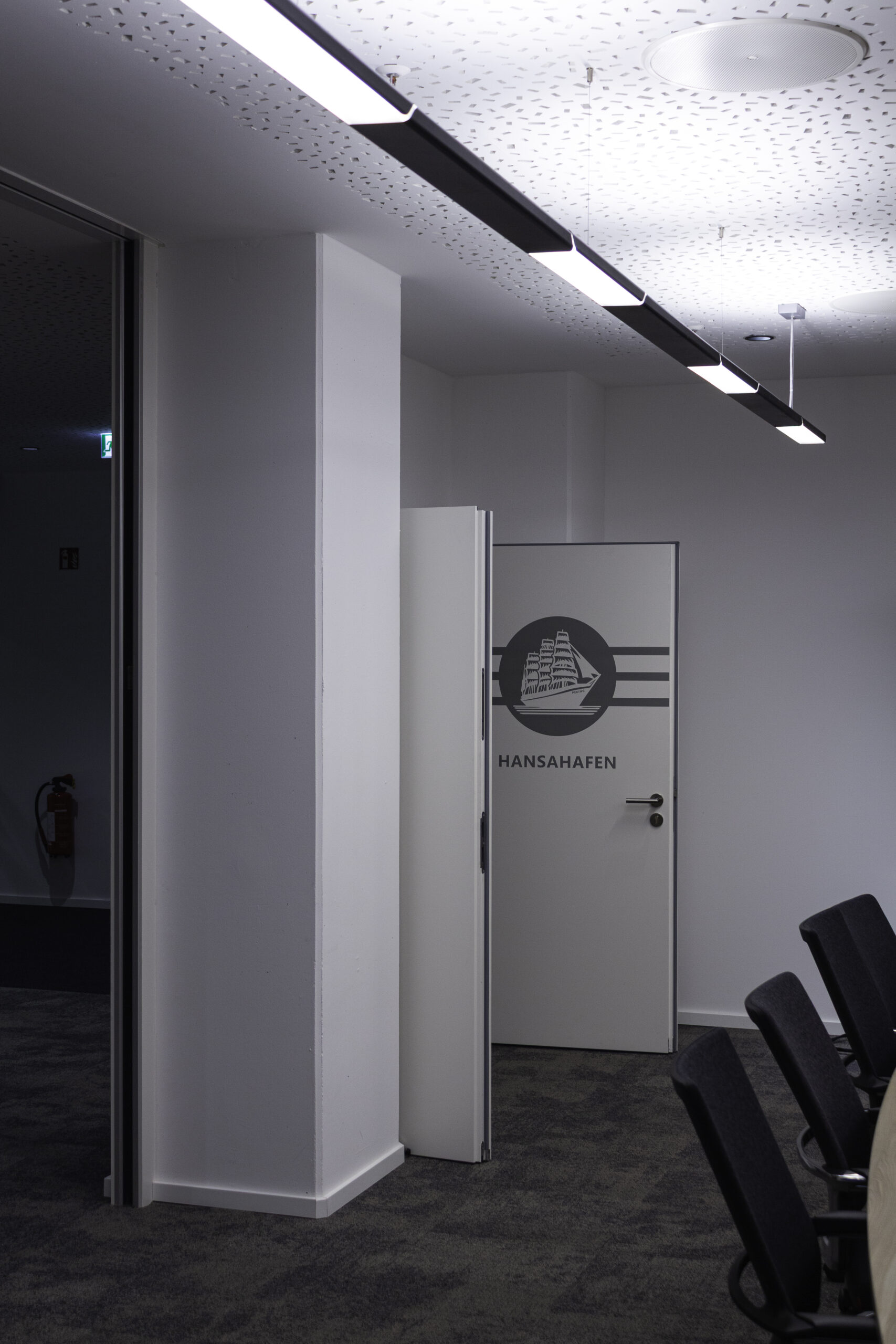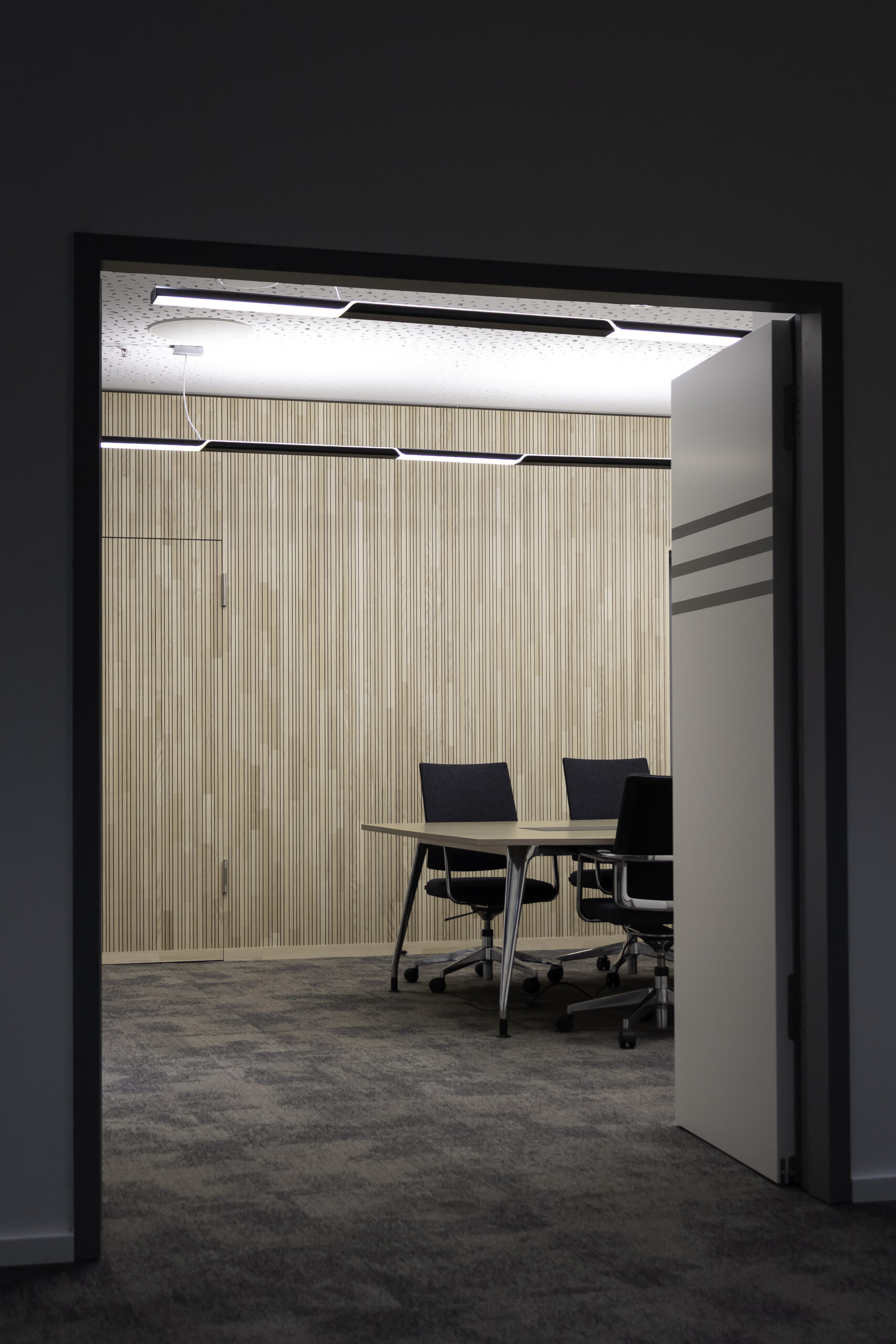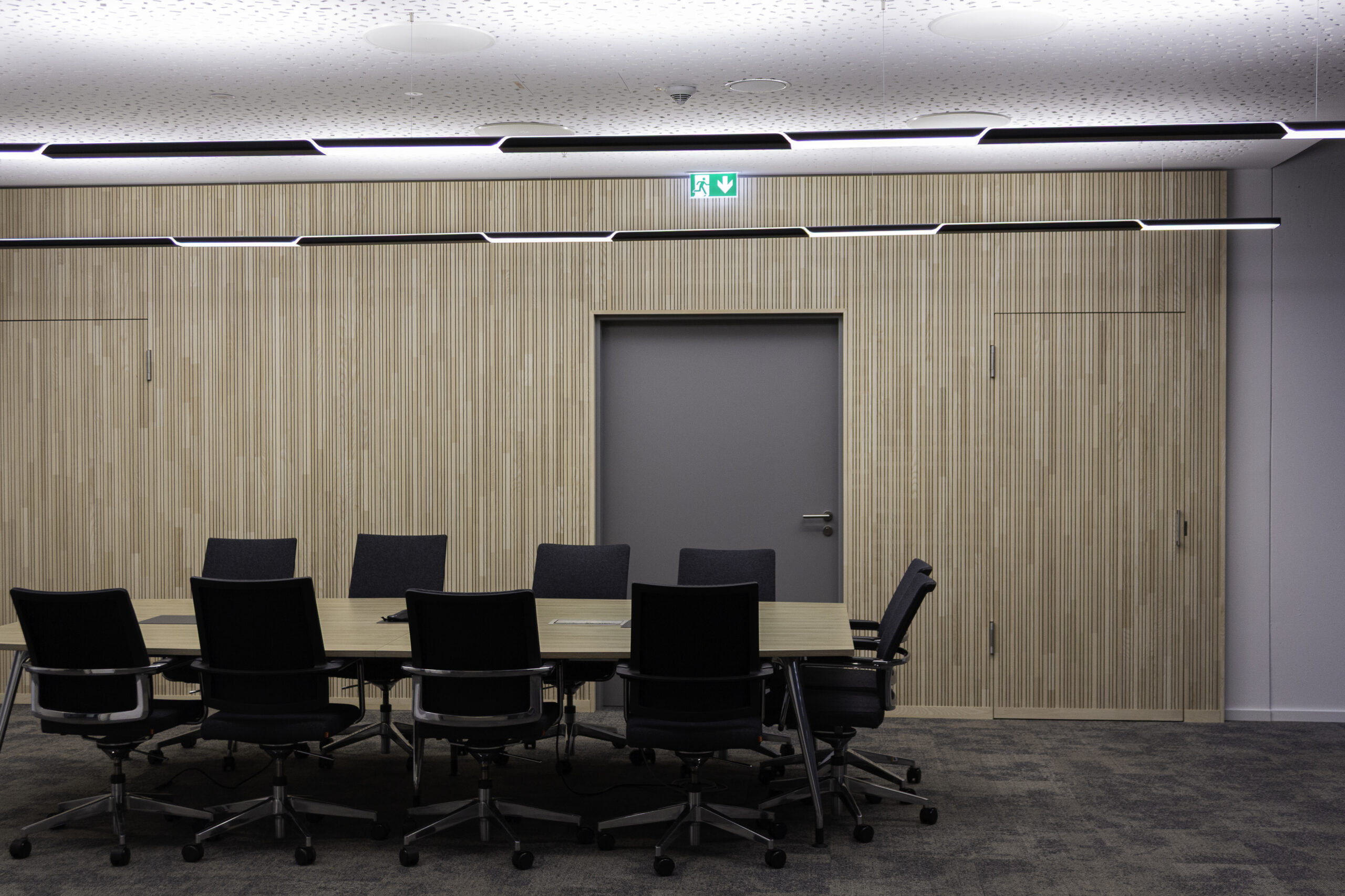 Neben dem Empfangsbereich entstand ein neuer Konferenzraum, der sich durch eine großzügige Falttür mit der offenen Teeküche verbinden lässt und so flexibel für Veranstaltungen genutzt werden kann. Die geölte, natürliche Holzverkleidung im Konferenzraum verbessert die Akustik und verleiht dem Raum zugleich eine warme, einladende Atmosphäre. Als erste Anlaufstelle für Gäste vereint der individuell entworfene Tresen Empfang und Poststelle in einem Element. Polygonale Holztafeln mit warm beleuchteten Fugen greifen die Form- und Farbensprache des Firmenlogos auf.